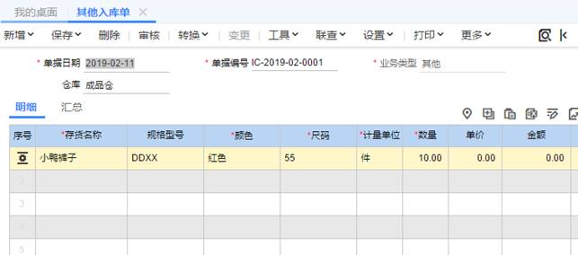 5、當軟件上面顯示的庫存數是負數時,就要錄入其他入庫單,數量填入負數對應的正數,比如庫存數是-10,那數量就錄入10,這樣庫存數量就是零了,如圖下: