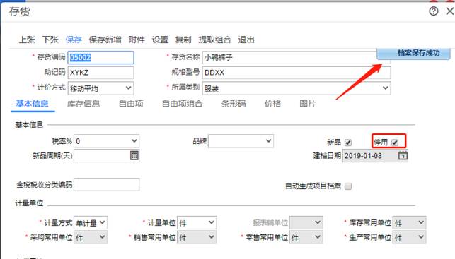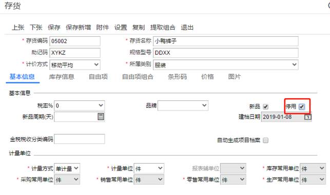 2、進入存貨界面,把“停用”選項打上勾,如圖下: