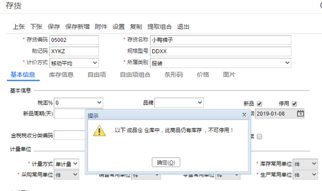 7、當庫存數量為零時,這時候我們再來停用存貨,就可以停用了,如圖下: