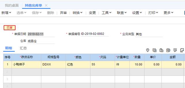 6、當軟件上面顯示的庫存數是正數時,就要錄入其他出庫單出掉,數量填入當前查詢出來的數,比如庫存數是10,那數量就錄入10,這樣庫存數量就是零了,如圖下: