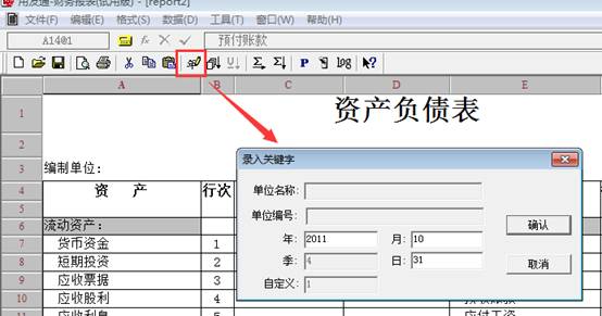 6、轉換為數據狀態后,就可以取資產負債表的數據了,點擊工具欄上的“年”的圖標,輸入要出報表的年月日即可,如圖下: