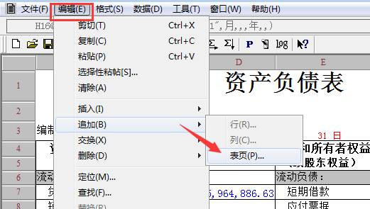 8、補充:同時取多個月的資產負債表,點擊“編輯”-"追加"-"表頁",如圖下: