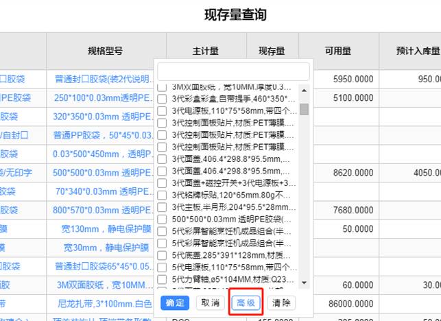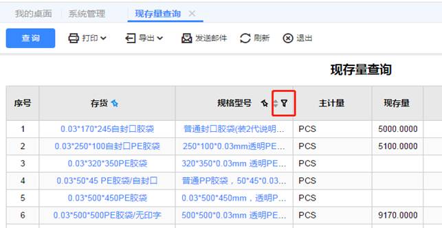 由于沒有選擇查詢條件,所以有庫存的存貨都會顯示,而我們需要過濾出相同產(chǎn)品名稱但規(guī)格不同的存貨,點(diǎn)“規(guī)格型號”上的“過濾”按鈕,如圖下: