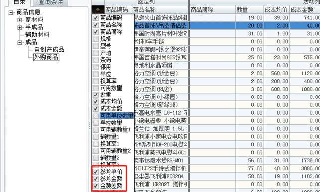 2、進入庫存狀況表界面,點擊商品編碼左邊的*,將參考單價,參考金額和金額差額勾選上,如圖下: