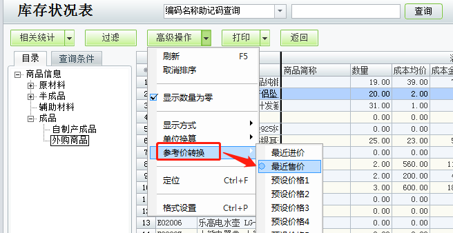 3、點擊高級操作,參考價轉換,選擇選擇最近售價,如圖下: