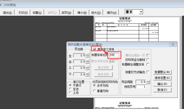 3、在打印預(yù)覽界面點(diǎn)擊“設(shè)置”,相關(guān)設(shè)置界面勾選“用自定義字體”,如圖下操作: