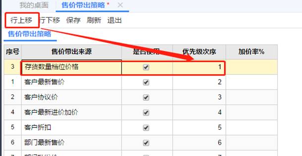 3、設置好價格后,還需要設置價格的優先級次,也就是以哪個價格為準,現在我們以存貨數量檔位價格為準,那么就要把這個價格調到級次為第1位,如圖下可以看出存貨數量檔位價格在第3位,點擊行上移,移到第1位即可
