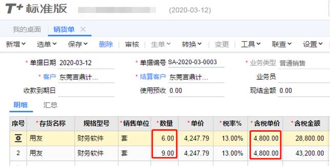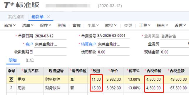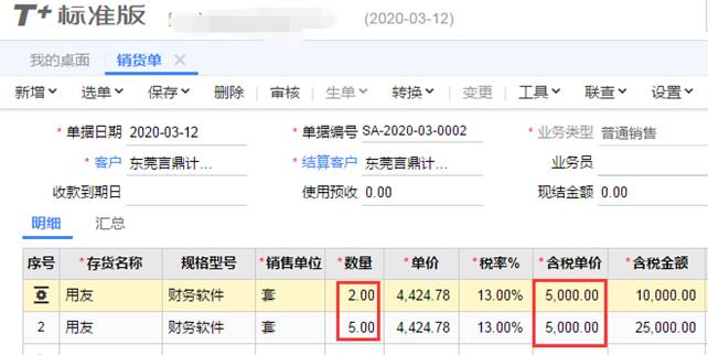 4、最后我們來填制銷貨單,錄入不同的數量,就會帶入不同的價格,如圖下: