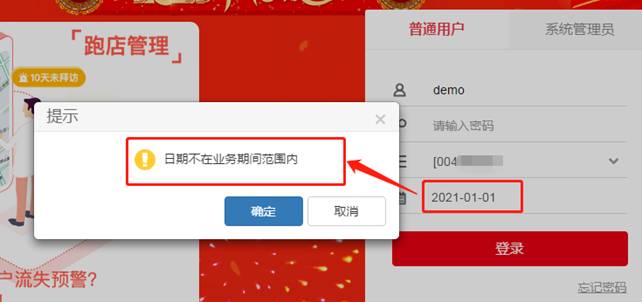 問:2021年登錄用友T+系統,出現如圖提示:日期不在業務期間范圍內。