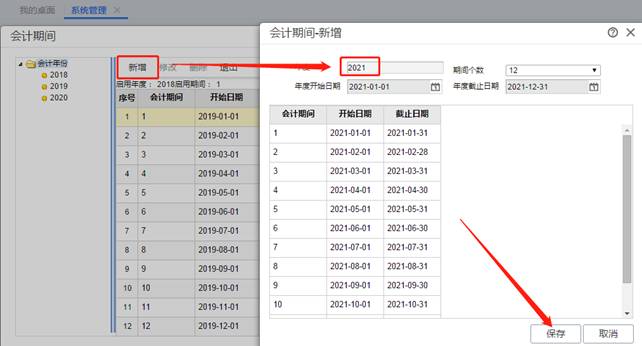 3、進入會計期間,點擊新增“2021”,并保存,如圖下。最后退出軟件,再以2021年就可以登錄系統了。