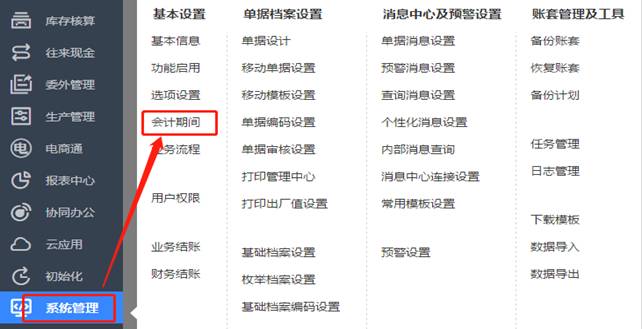 2、進入T+系統后,點擊左下角菜單“系統管理”-“會計期間”,如圖下: