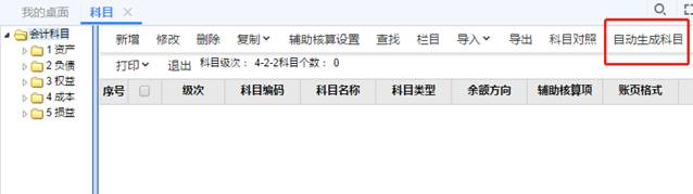 2、增加2021年度就不再說明,參考第一種情況。以2021年登錄賬套,進入“基礎設置”-“科目”界面并點擊“自動生成科目”,如圖下操作:
