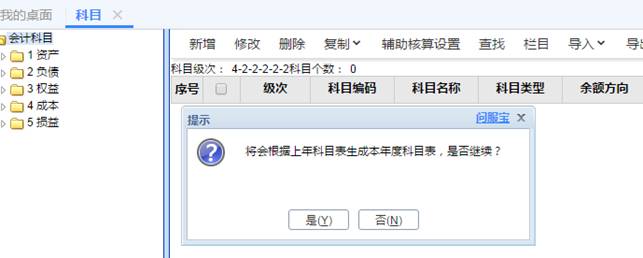 3、在彈出對話框提示:將會根據上年科目表生成本年度科目表,是否繼續,點“是“即可, 如圖下: