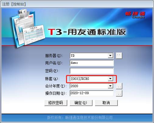 2、選擇需要導入的賬套并確定登錄,如圖下: