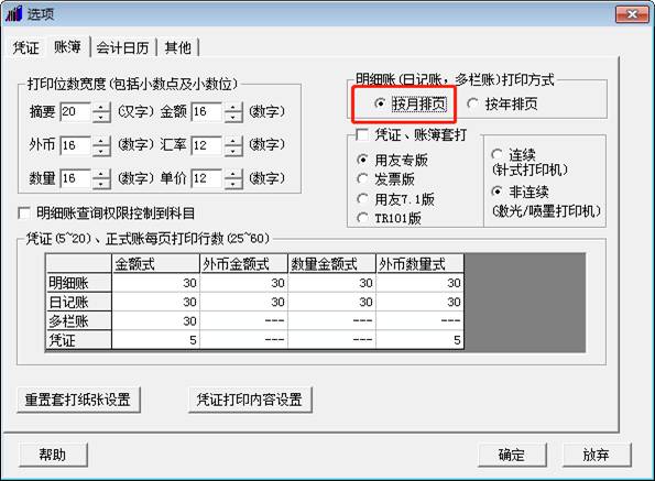點(diǎn)擊“賬簿”頁(yè)簽,勾選明細(xì)賬打印方式為“按月排頁(yè)”,如圖下: