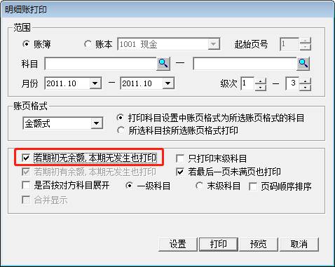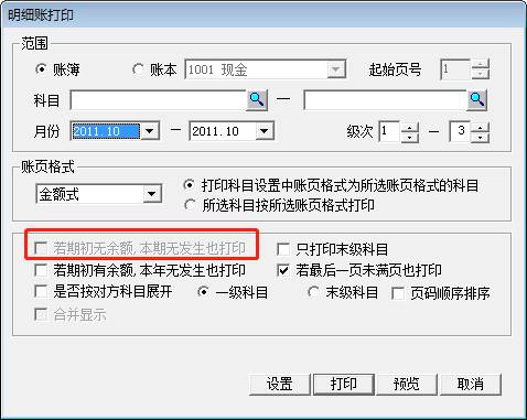 問:打印用友T3明細(xì)賬時(shí),“若期初無(wú)余額,本期無(wú)發(fā)生也打印”是灰色,不可以選擇,如圖下: