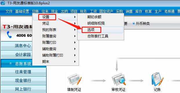 答:點(diǎn)擊總賬-設(shè)置-選項(xiàng),如圖下:
