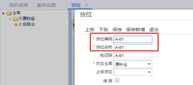 5、錄入貨位編碼與貨位名稱并保存,如圖下:
