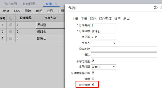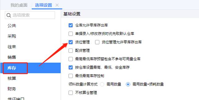 2、選中“庫存”頁簽,勾上“貨位管理”并保存,如圖下:
