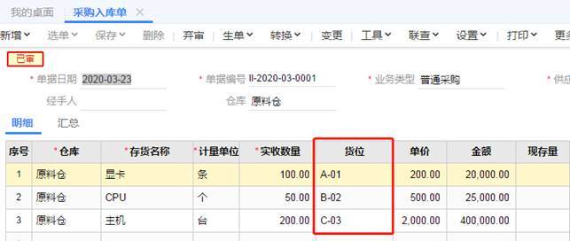 6、貨位設置完成后,當供應商送貨過來,就要錄入存貨所在的倉庫與貨位,如圖下入庫單:
