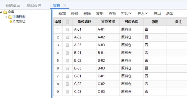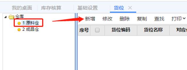 4、倉庫啟用貨位后,就要設置倉庫里有哪些貨位了,以原材倉為例來增加貨位,點擊基礎設置-貨位,選中原材倉,點新增,如圖下操作: