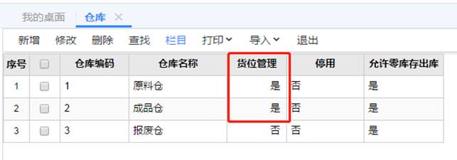 3、貨位管理啟用后,還需要設置哪些倉庫要進行貨位管理應用,如圖下,有三個倉庫,我們只需要對材料倉與成品倉進行貨位管理,分別雙擊打開原材倉與成品倉,勾選上“貨位管理”并保存,如圖下操作:
