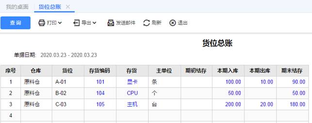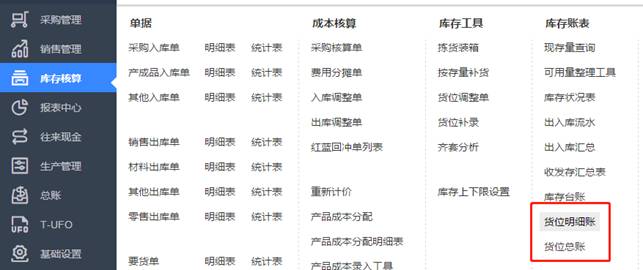 8、補充1:如何查詢貨位的總賬或者明細賬呢?點擊庫存核算,就可以看到相應的貨位賬表了,如圖下: