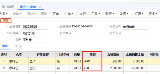 7、當出貨給客戶時,也同樣需要錄入出庫的倉庫與貨位,如圖下出庫單: