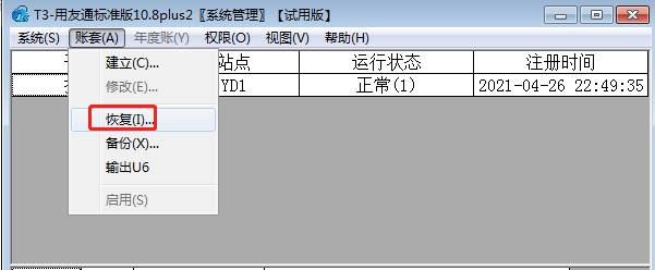 6、備份數據恢復,點擊賬套-恢復,選擇備份的數據打開即可恢復,如圖下操作: