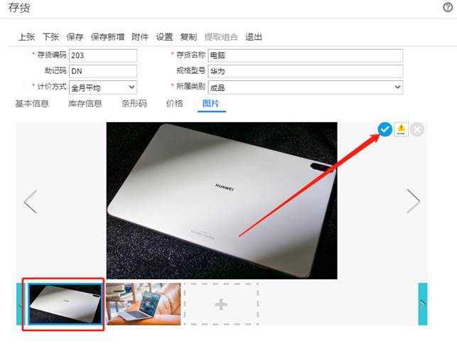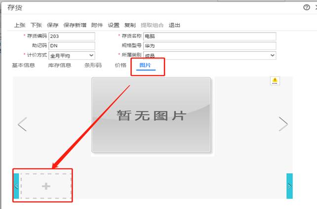 答:用友可以實現此要求,以用友T+為例,點擊基礎設置-存貨,雙擊打開某個產品,如圖下電腦為例,點擊“圖片”頁簽左下角對應的加號,如圖下: