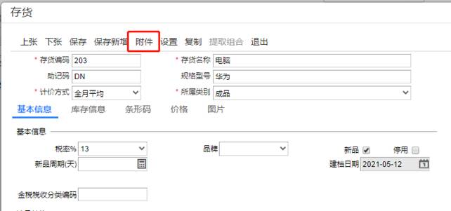 上傳產品的說明書或者掃描件等,需要點擊存貨上的“附件”,如圖下: