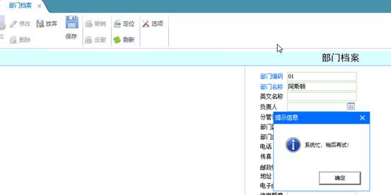 問:用友U8新增部門檔案,提示:系統忙,稍后再試。如圖下: