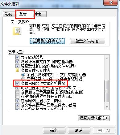 點擊“查看”頁簽,把“隱藏已知類型的擴展名”前面的勾去掉并保存,如圖下: