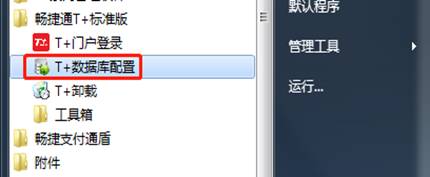 再點擊電腦左下角開始-所有程序-暢捷通T+標準版- T+數據庫配置,如圖下: