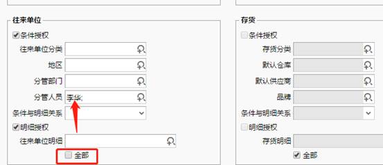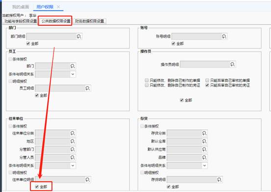 4、點擊“公共數(shù)據(jù)權(quán)限設置”頁簽,取消往來單位中“全部”前面的勾,如圖下: