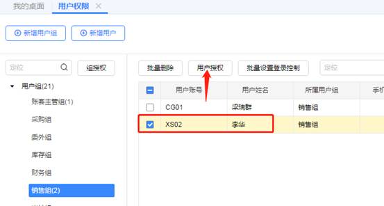 3、選中業(yè)務員李華并點擊用戶授權(quán),如圖下: