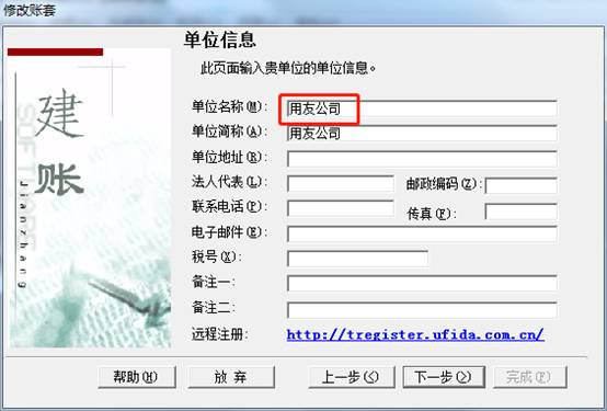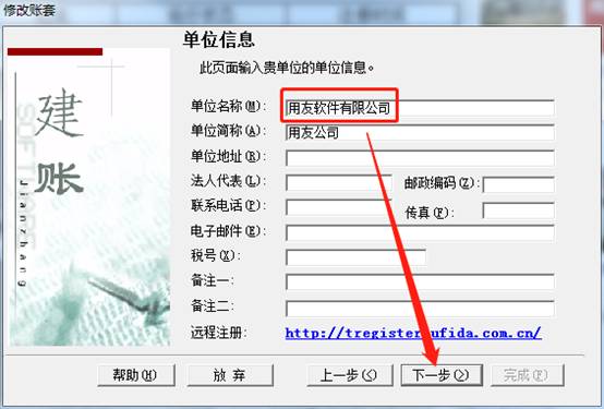 5、然后把“用友公司”改成所需要的全稱“用友軟件有限公司”或者改成其他公司名,再點(diǎn)擊下一步,如圖下: