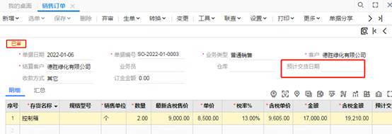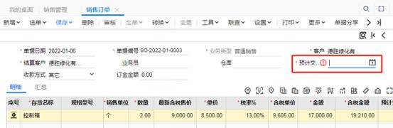 4、設置好后,我們再來錄入銷售訂單,此時“預計交貨日期”已帶*就為必錄字段,當不錄入此字段時就出現嘆號提醒不讓保存,如圖下: