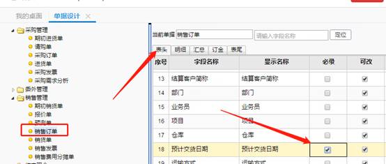 3、點擊銷售管理中的銷售訂單,在表頭頁簽中的找到“預計交貨日期”,同時勾選上“必錄”并保存,如圖下: