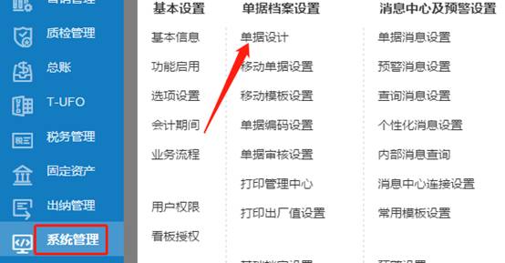 2、鼠標放置系統管理,在跳出來的列表中點擊“單據設計”,如圖下: