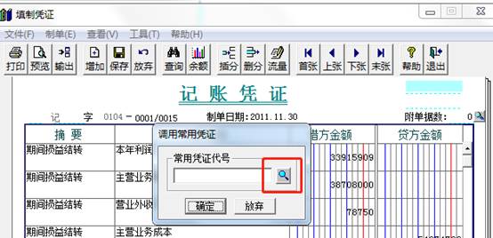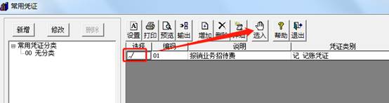 然后錄入常用憑證代號或者點放大鏡去選擇常用憑證,如圖下操作:
